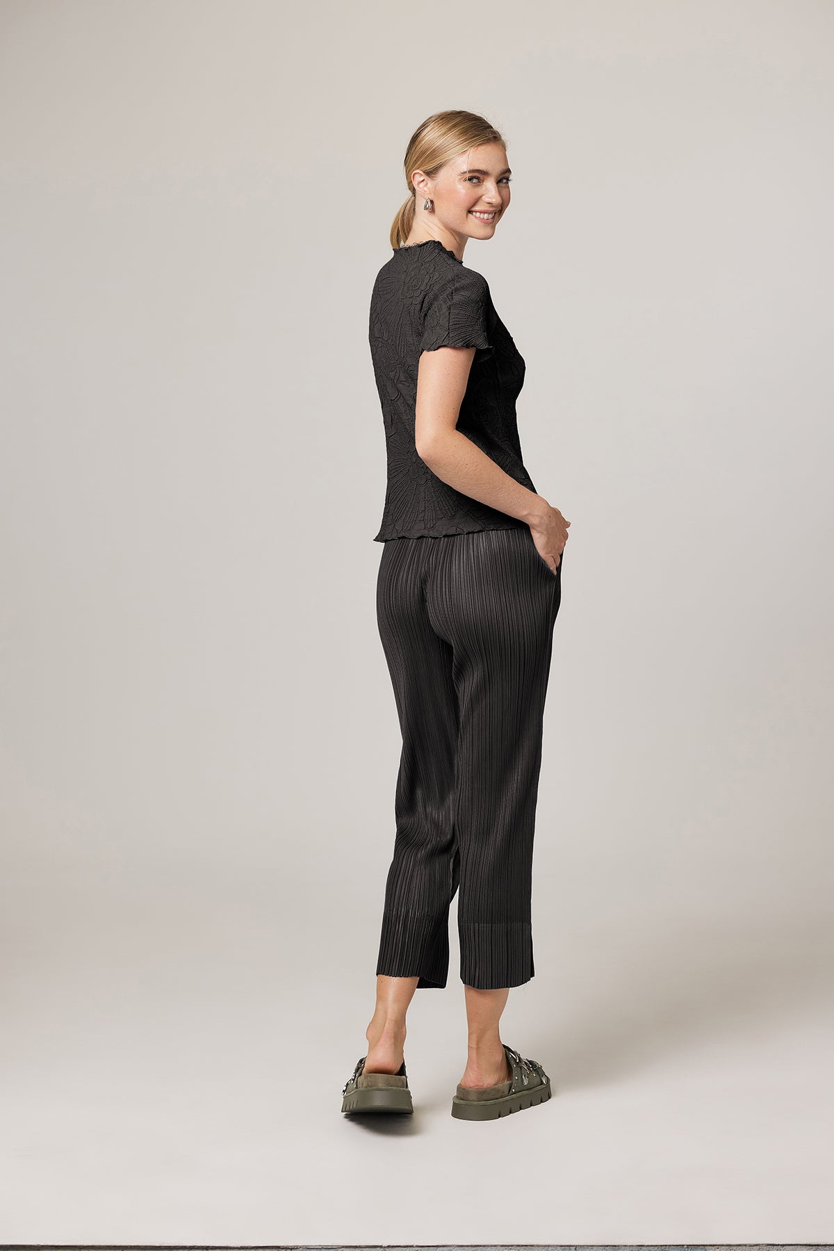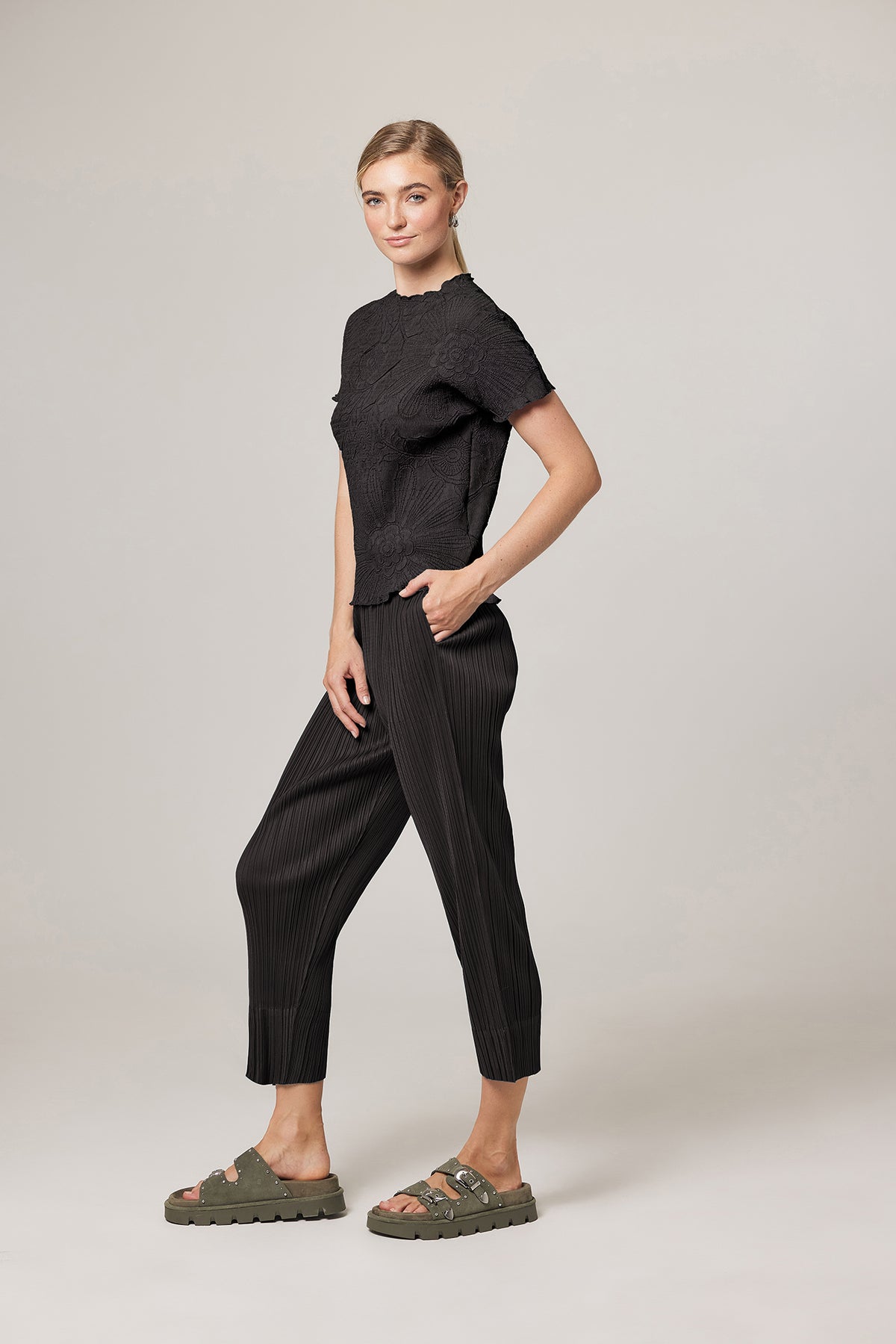This cap-sleeve floral jacquard top is an essential piece for the spring and summer seasons. The lettuce edge details at the sleeves provide a feminine edge.