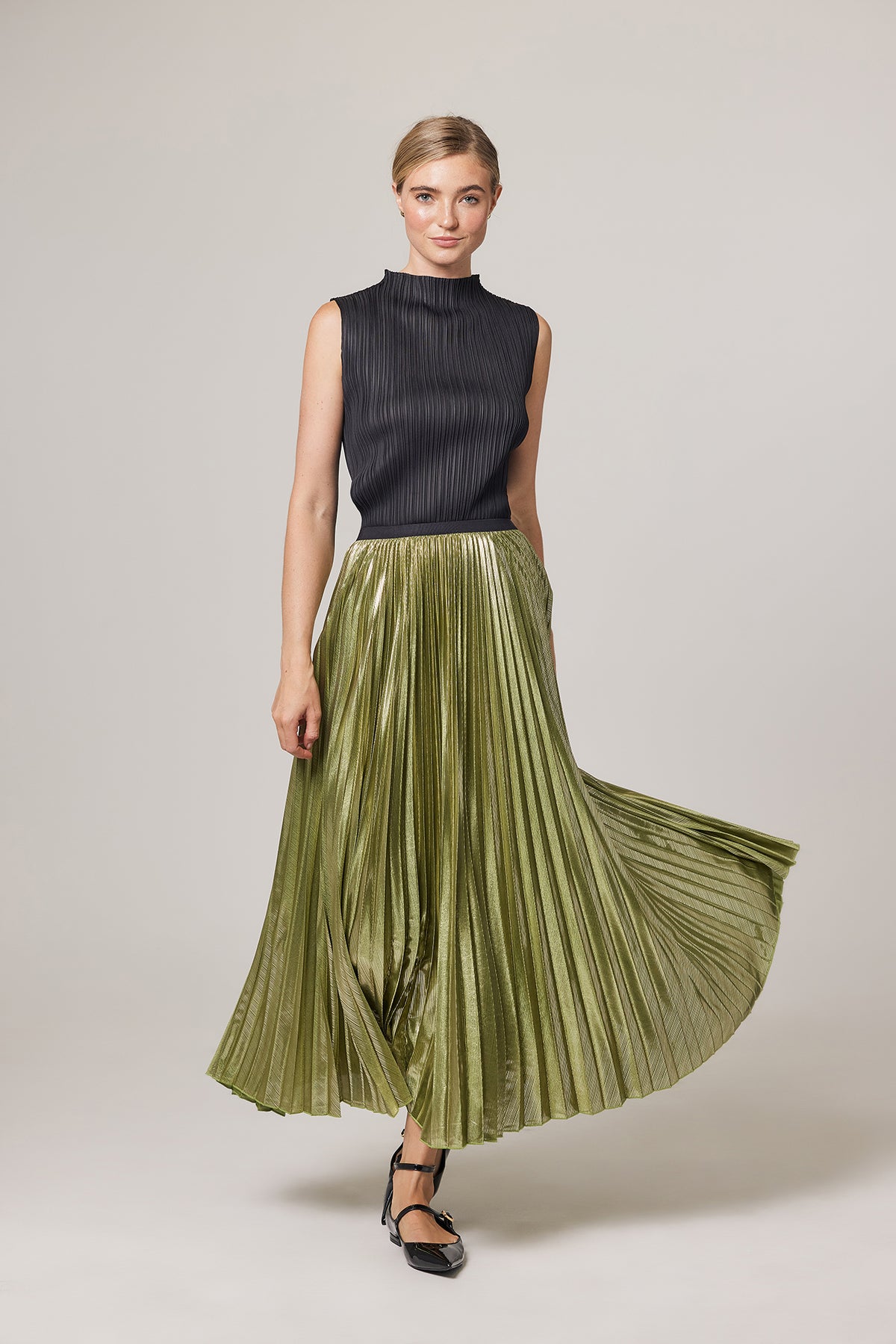 Prepare to captivate every eye in the room with our enchanting Esther Metallic Accordion Pleated Skirt – the ultimate statement piece for your most special occasions. As you move, the long accordion pleats gracefully sway and glisten, leaving an indelible impression. Crafted from Luxe Metallic Lamé, this skirt ensures you're effortlessly chic and confident in the crowd. With a soft elastic waistband, you'll experience both secure and all-day comfort during your holiday and New Year celebrations.