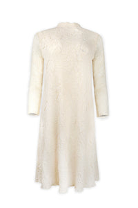 This luxe dress is crafted from our signature stretch jacquard with shear crinkle texture sleeves that finish with feminine lettuce edge details.