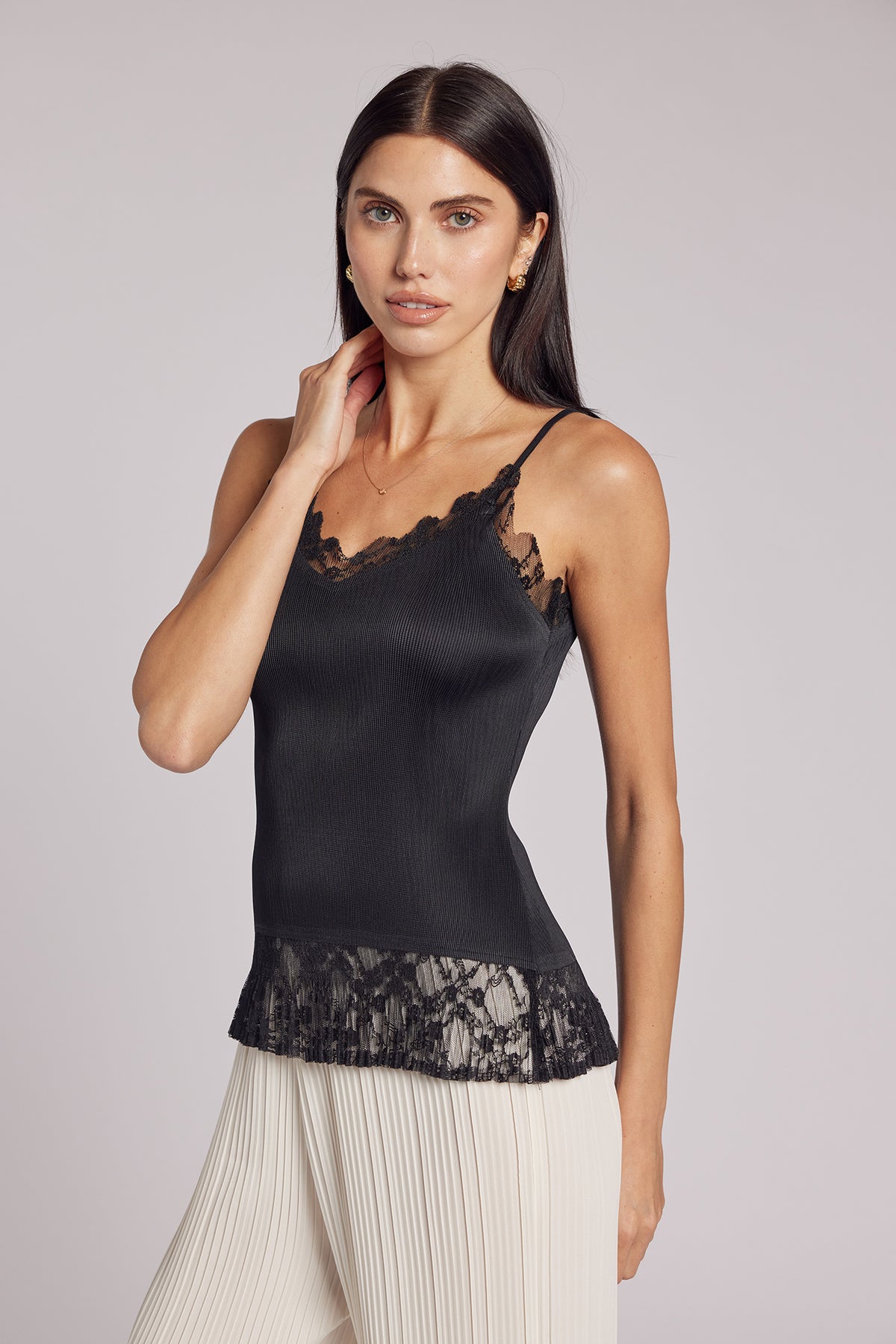 With a plissé texture and a luxurious sheen, the mock neck tank top exudes an air of sophistication and refinement.