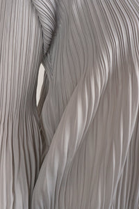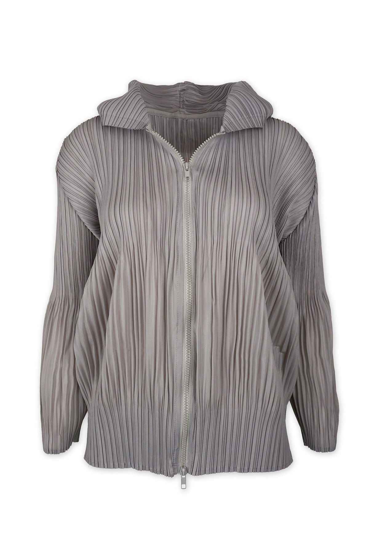 Vanessa Jacket features a sophisticated two pleat size variations on its body. This jacket exudes elegance, seamlessly combining the luxurious plissé satin fabric with a contemporary zip-front style. Equipped with a hood and pockets, it offers both functionality and style.